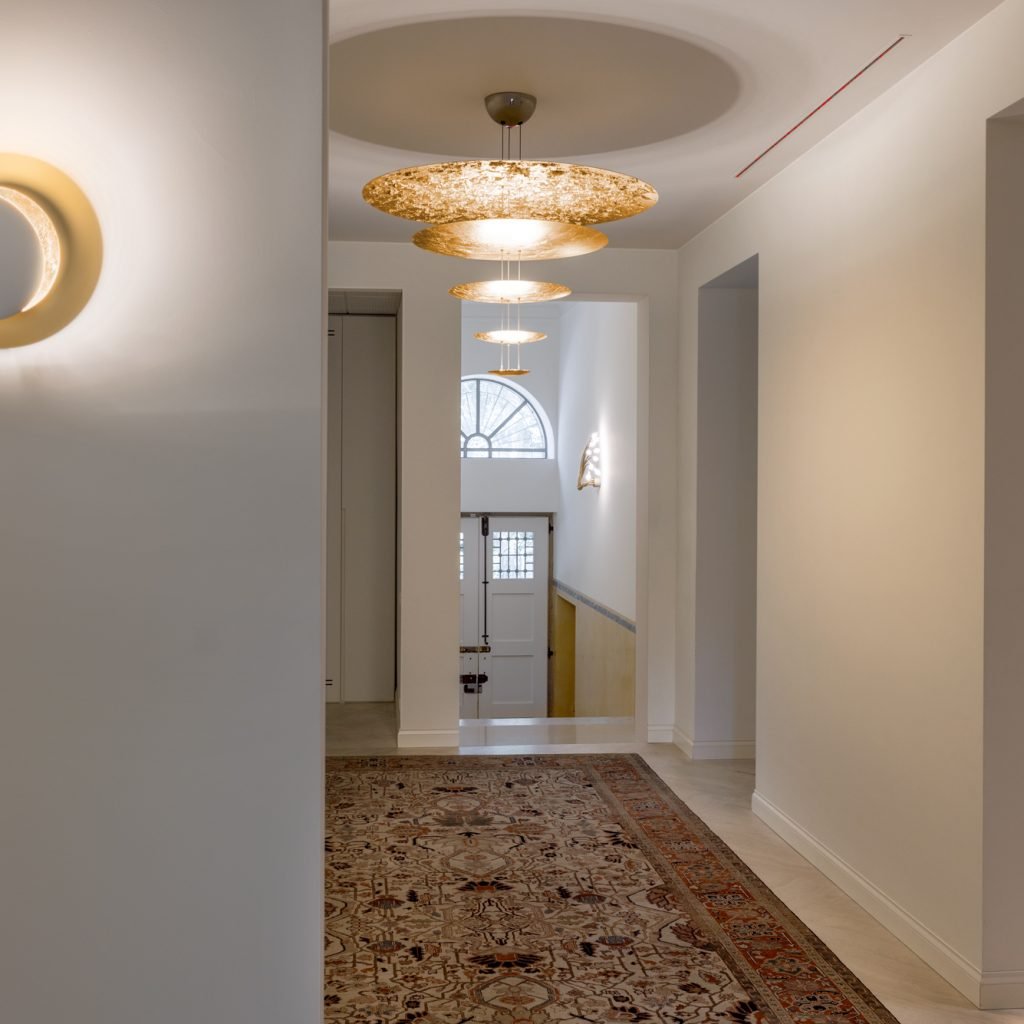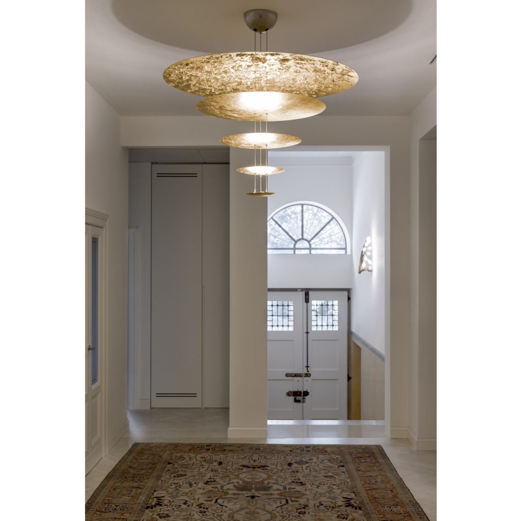 Macchina della Luce émerge de la collection Luci d’Oro, qui est née elle aussi en tant que réflexion sur la couleur de la lumière : la lumière dorée du soleil, du feu ; des lumières chaudes, où le concept de réfraction commence à prendre forme dans l’esprit d’Enzo Catellani, qui l’appliquera souvent à d’autres créations.