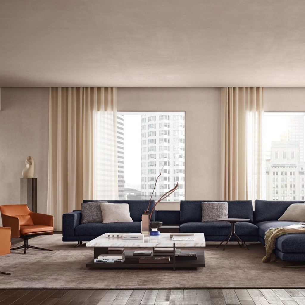 À l’enseigne du confort, deux profondeurs d’assise sont disponibles, pour une détente maximale. Le système Mondrian est associé à la collection homonyme de tables basses et de consoles derrière le canapé.